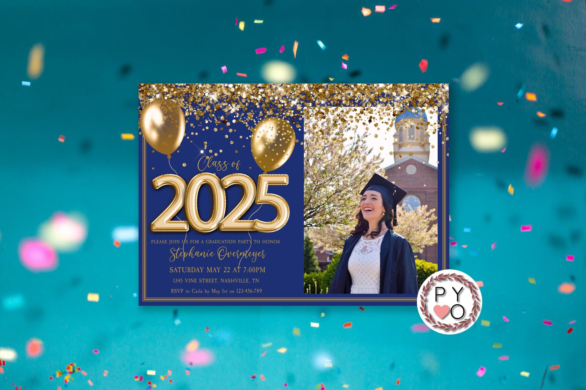 Class Of 2025 Blue Gold Photo Graduation Invitation Printable Template Glitter Editable Graduate Editable Invite High School College Grad