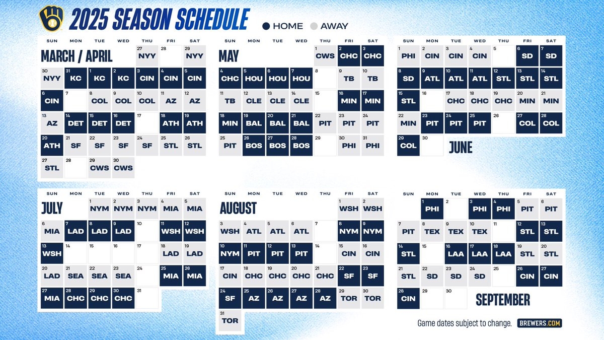 Adam McCalvy On X The Brewers 2025 Schedule Is Set Opening Day March 27 Yankees Home Opener March 31 Vs Royals Starting In 25 Teams Will Play Two 3 game Series Against