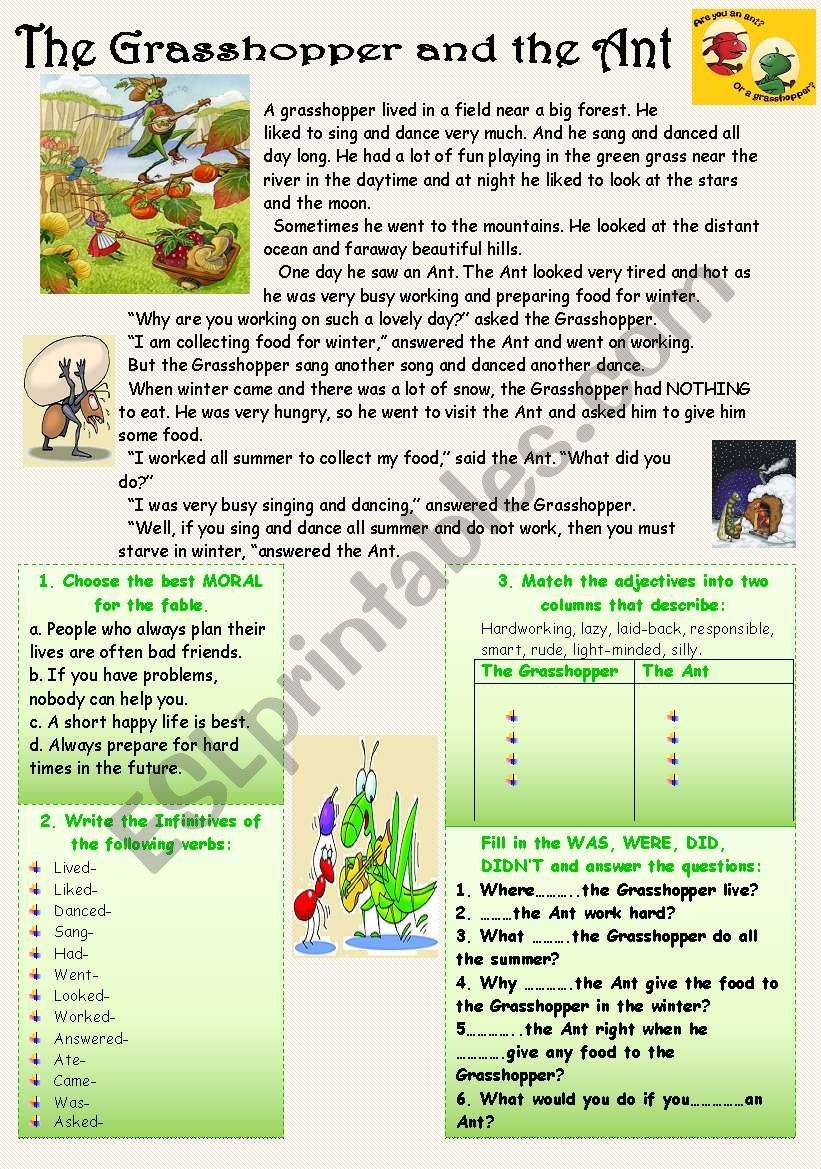 Reading comprehension With Moral THE GRASSHOPPER AND THE ANT ESL Worksheet By Nurikzhan