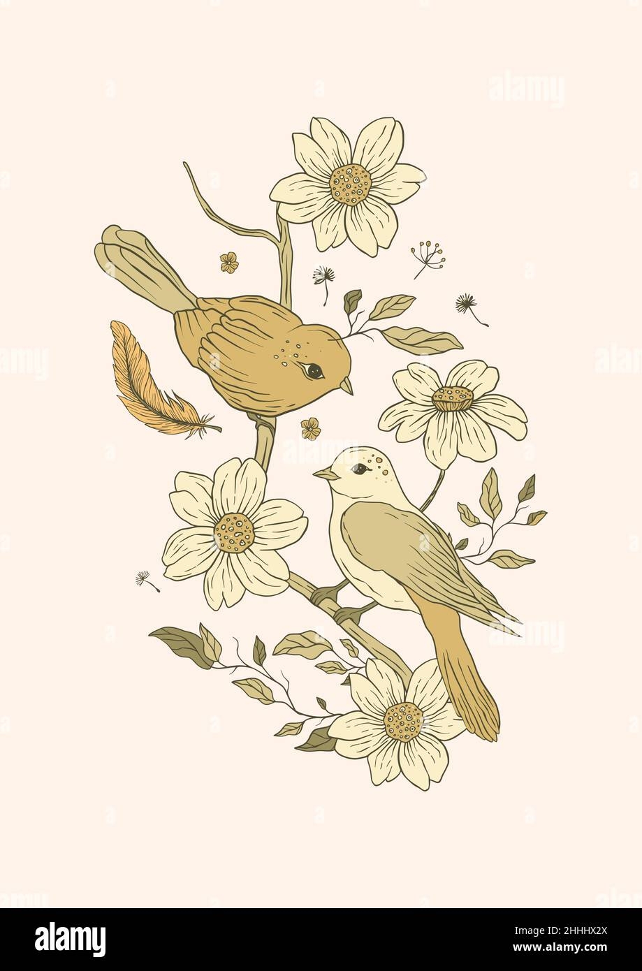 Vintage Bird Couple And Daisy Flowers Printable Poster Stock Vector Image Art Alamy