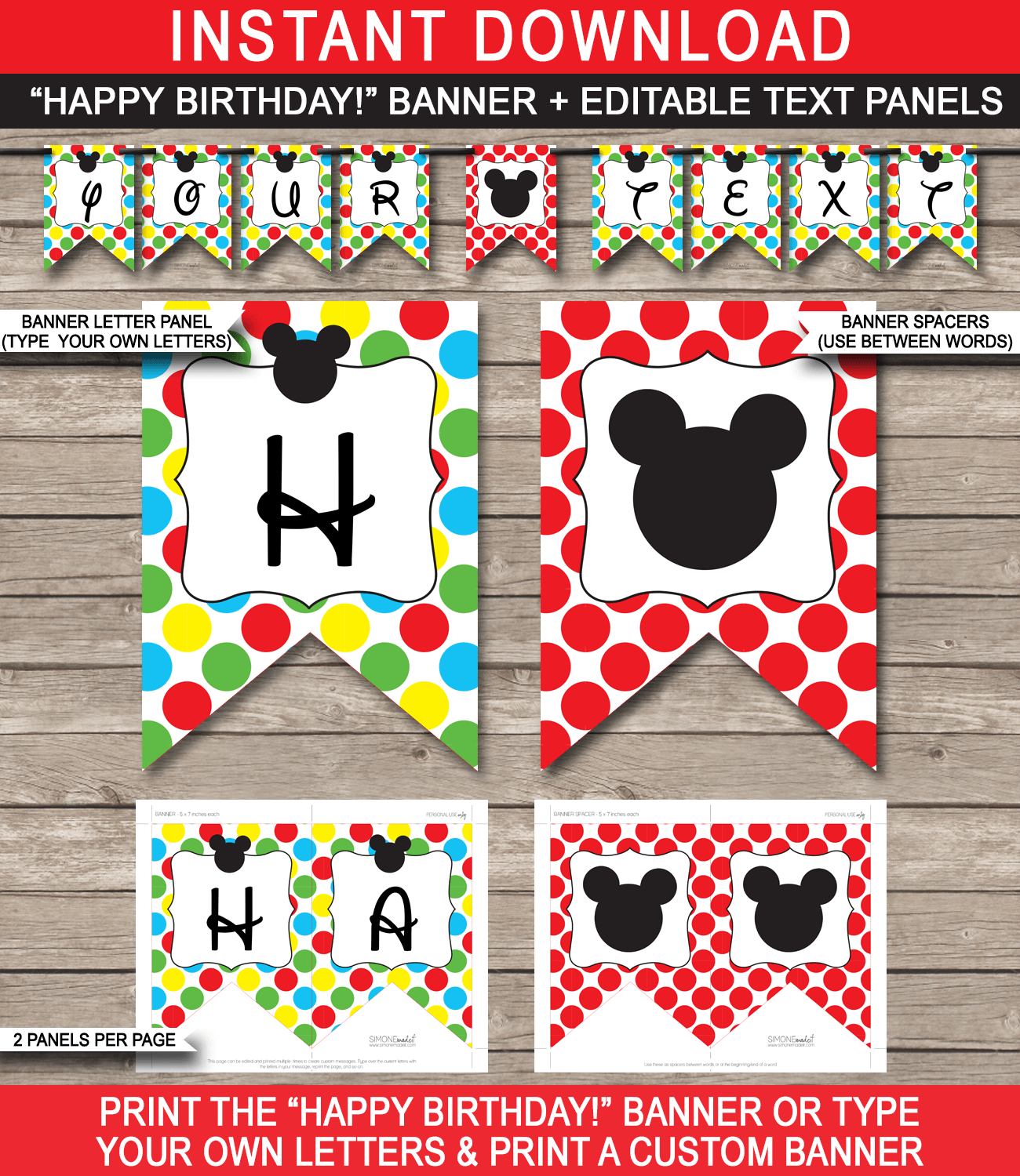 Mickey Mouse Party Banner Template Birthday Banner Editable Bunting