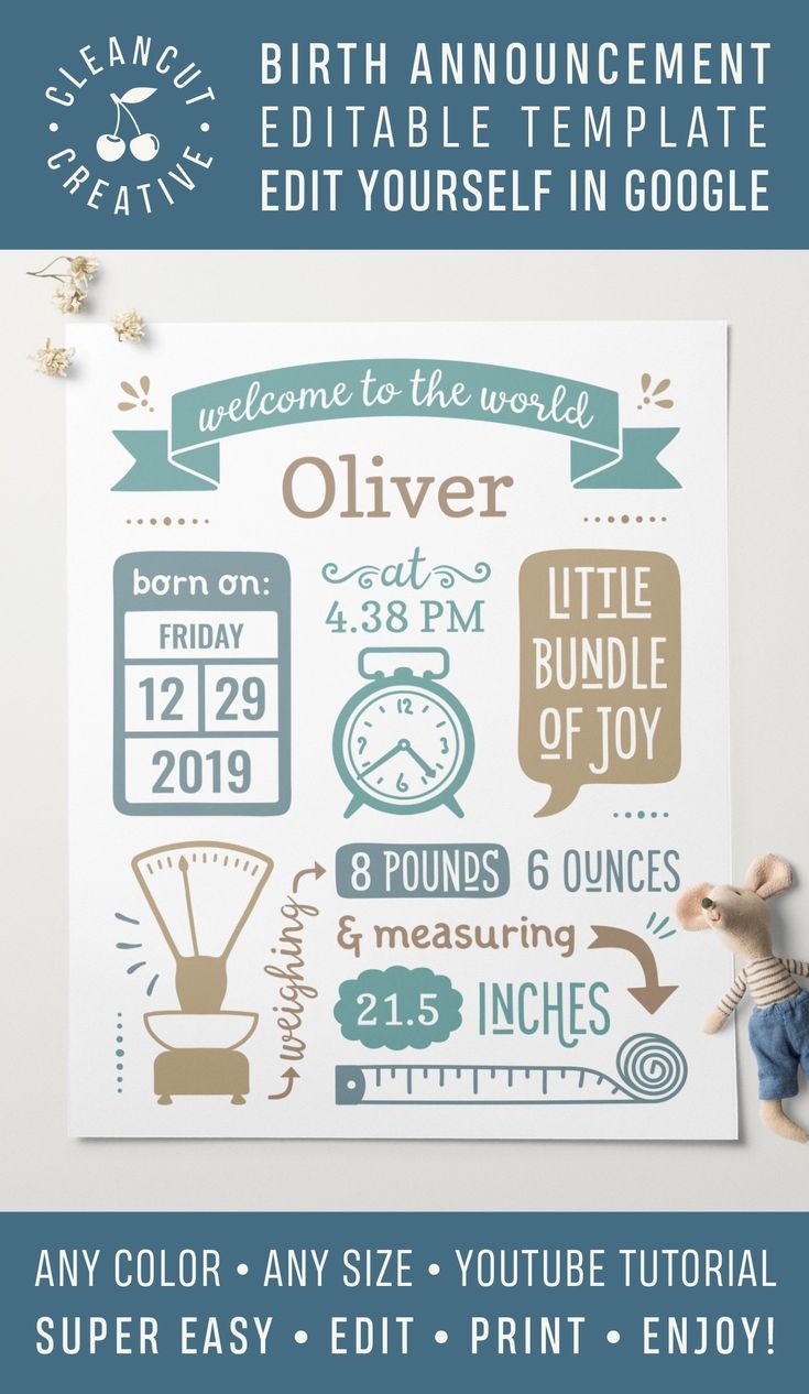 BIRTH ANNOUNCEMENT Template GOOGLE Edit Baby Stats 552517