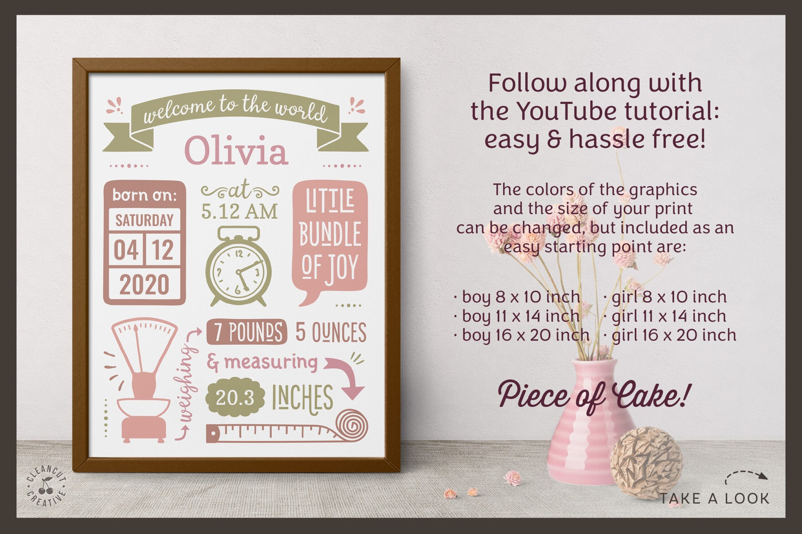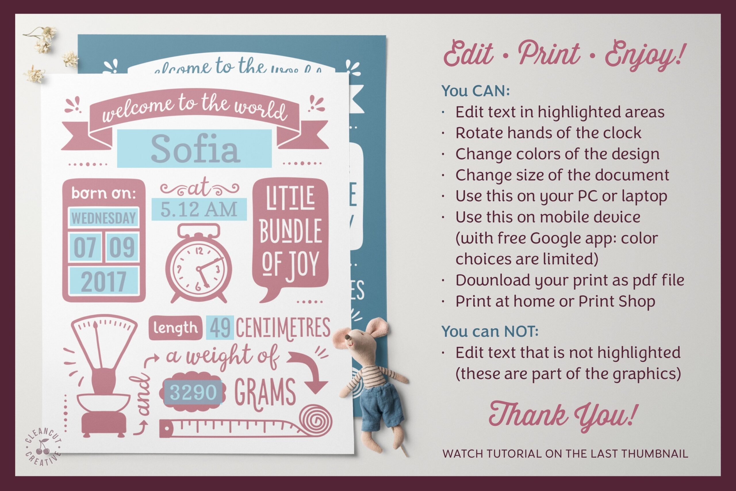 Printable BIRTH ANNOUNCEMENT Template GOOGLE Edit Baby Stats Print By CleanCutCreative TheHungryJPEG