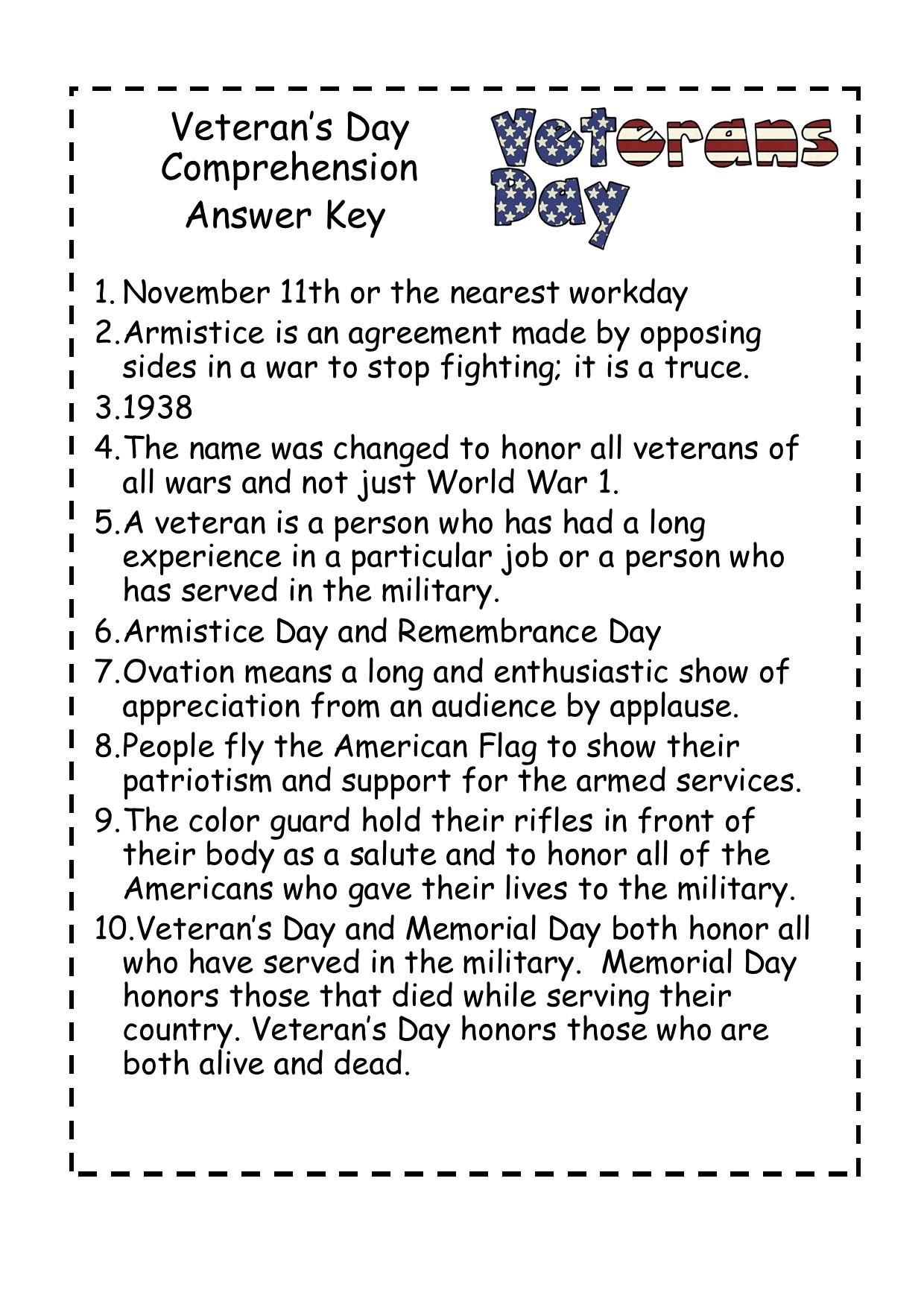 Veterans Day Reading Comprehension Questions Patriot Day Worksheets Made By Teachers