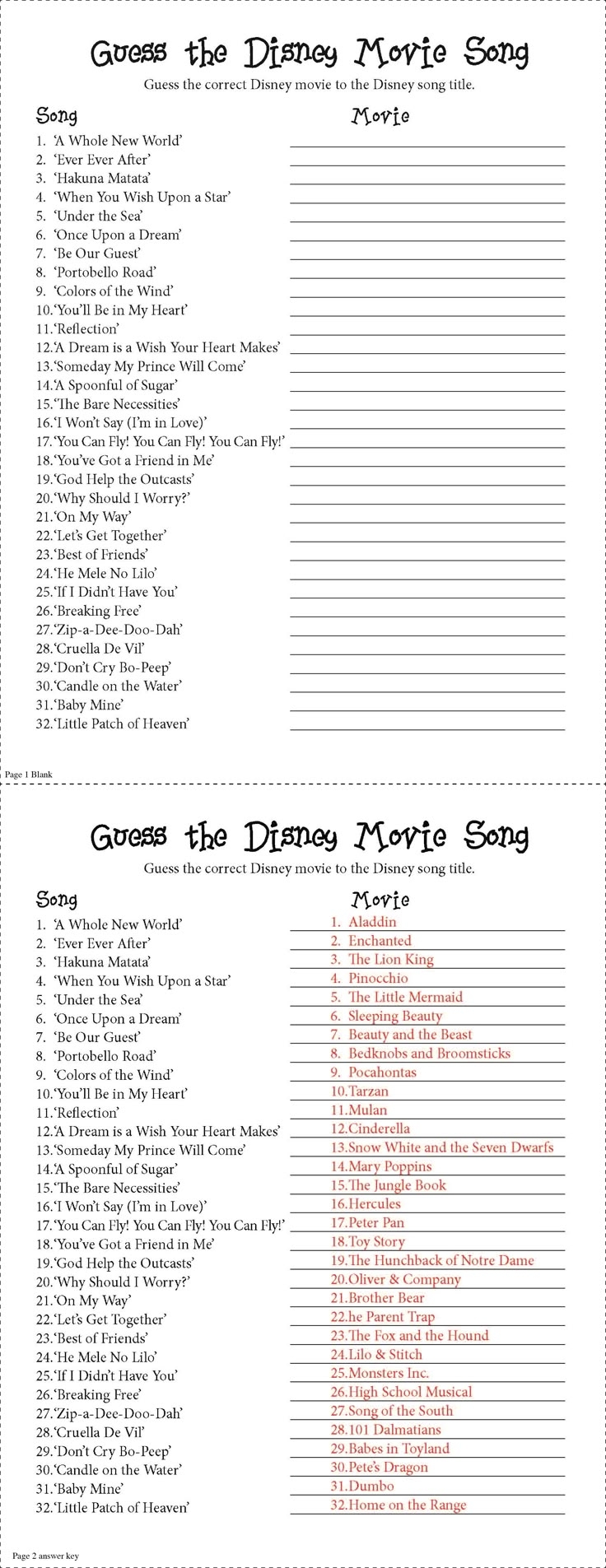 Guess The Disney Movie Song Party Game I Made This For A Baby Shower Based Off A Internet Qui But It Could Be Used For Anything Not As Easy As It Looks