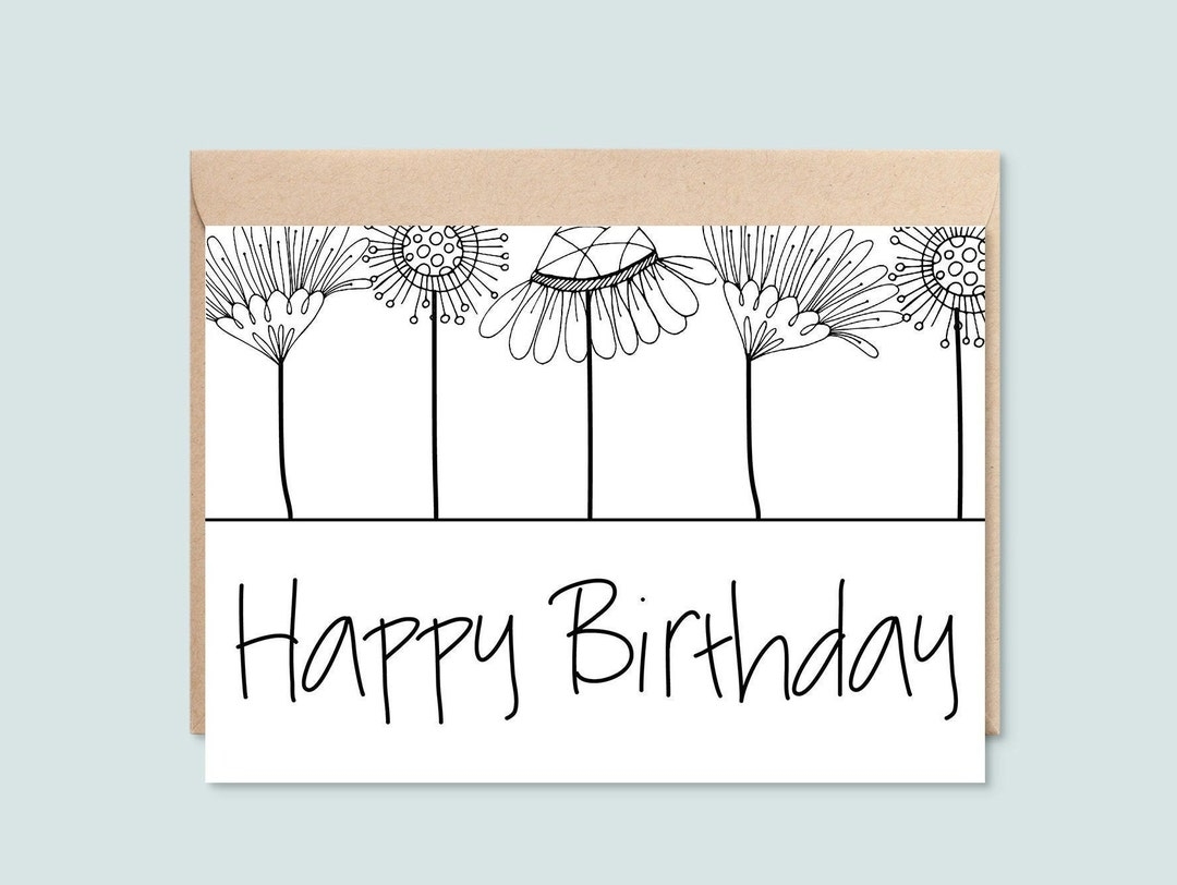 Printable Happy Birthday Card Black And White Floral Line Art Instant Download 5X7 Greeting Card Etsy UK