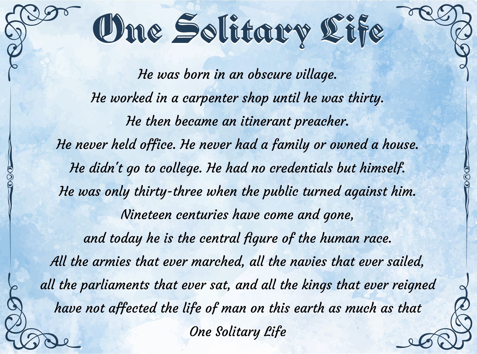 Share the uplifting message of the One Solitary Life poem with our printable version. It’s a beautiful reminder of the difference one person can make in the world. Download, print, and display this meaningful poem in your home or give it as a heartfelt gift to someone special.