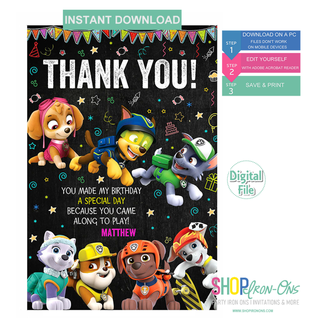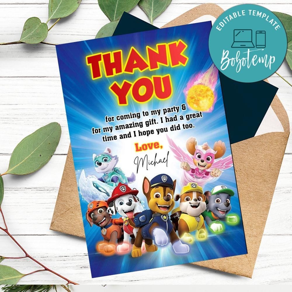 Paw Patrol Mighty Pups Thank You Card Customizable Template DIY Bobotemp