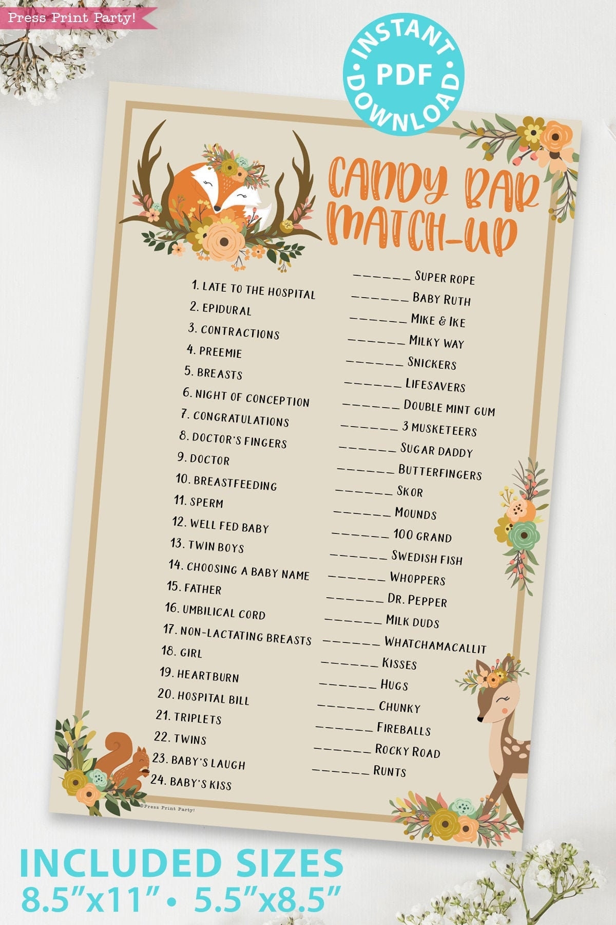 The Printable Woodland Animal Candy Bar Shower Game is a perfect way to add some excitement to your baby shower. Guests will have a blast trying to match the candy bars to the corresponding woodland animals. It’s a great icebreaker and will get everyone laughing and chatting!