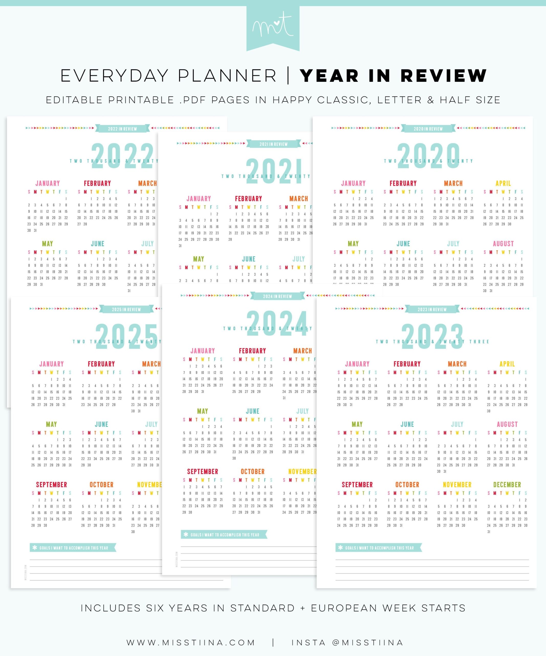2020 2025 Year In Review Calendars EDITABLE Everyday Planner Pages Happy Classic Letter Half Size Free Font PDF Printables Inserts Etsy